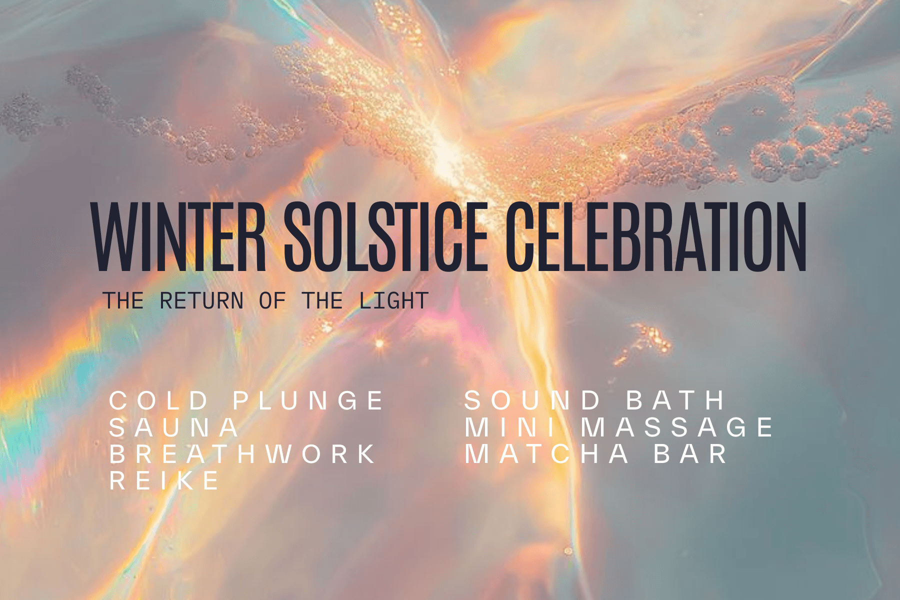 Celebrate the turning point of the year — the darkest night, welcoming back the light through rest, reflection, and reconnection. Sauna | Plunge | Breathwork | Reiki | Sound Bath| Mini Massages | Matcha Bar. Partners include: The Space Between, Move Therapy, West Loop Spine and Stability, Gold Coast Coffee, and Lovely Intentions.
